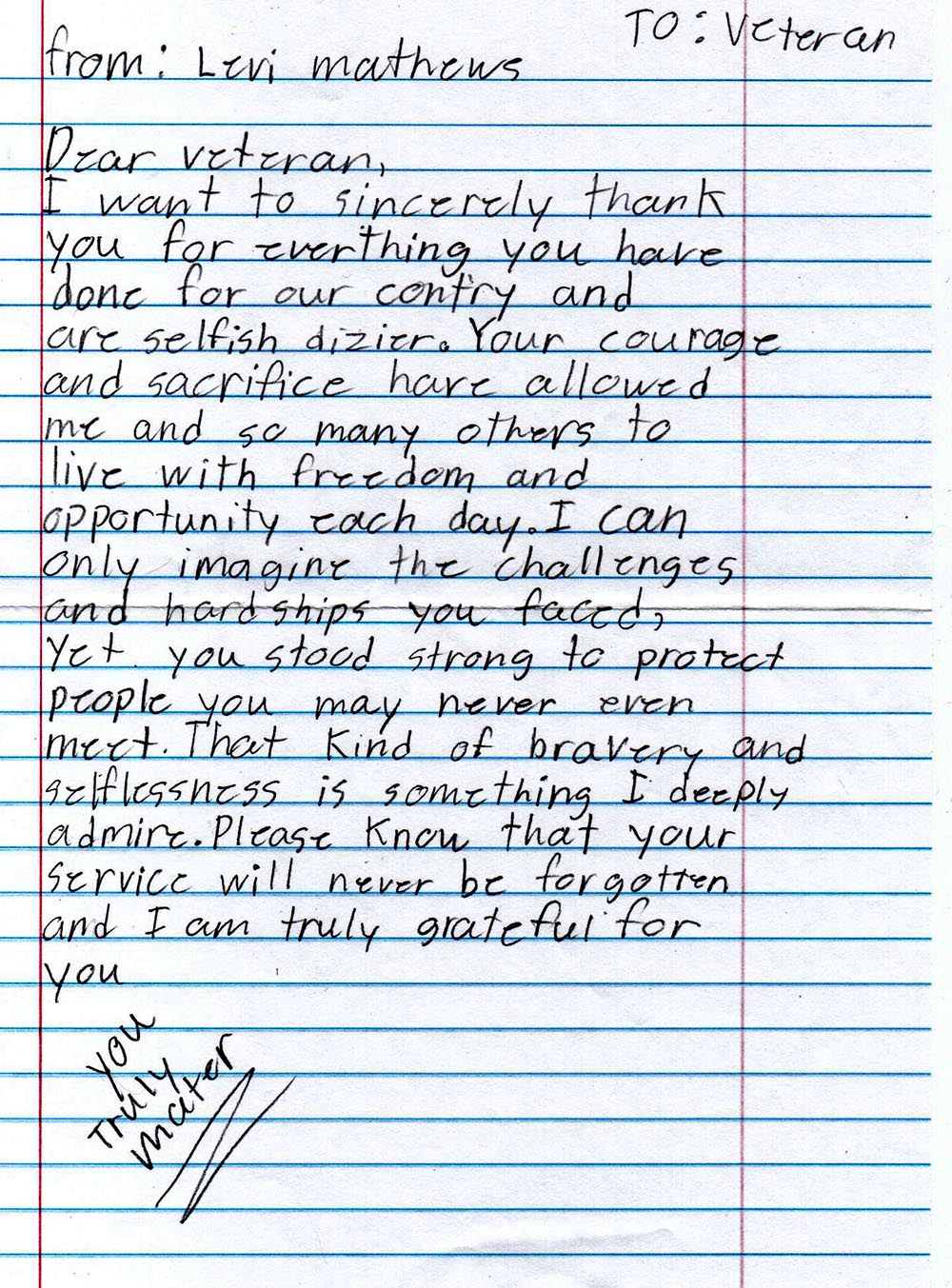 ‘Letters to Veterans’ From Area Students: Today’s Letter Written by Levi Mathews