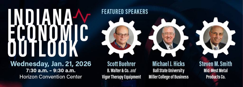 MUNCIE, IN — Registration is now open for the Indiana Economic Outlook, Wednesday, Jan. 21, 2026, at the Horizon Convention Center. In its 30th year, this popular event for the Muncie business community will offer breakfast, an economic forecast for the state and nation by Ball State University professor Michael Hicks, and a panel discussion on the challenges facing Indiana manufacturing firms with keynote panelists Steven Smith and Scott Buehrer.