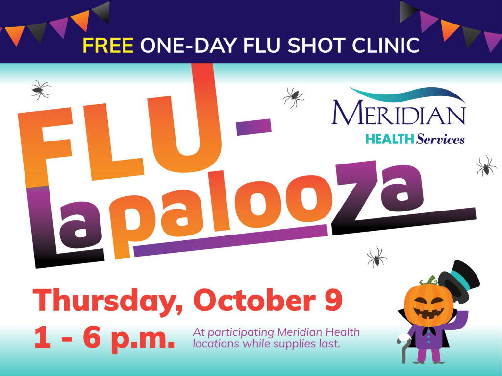 Please mark your calendar to receive your FREE flu shot during Meridian’s Flu-Lapalooza one-day-only event on October 9 from 1 to 6 p.m. at the Meridian location nearest you. Learn more at MeridianHS.org.