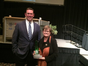 Jud Fisher is pictured with Juli Metzger and the John W. and Janice B. Fisher Governance Award she received. Photo provided.